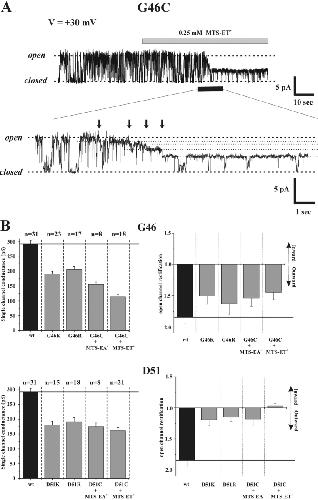 Figure 3. . SCAM using MTS-ET+ shows three residues in E1 accessible to modification in single open hemichannels. (A) Plot of the percentage change in unitary conductance for each residue after application of 1.0 mM MTS-ET+. The change in unitary conductance represents the mean percentage change in the slope conductance relative to the corresponding Cys substituted mutant measured at Vm = 0 from fitted open channel I-V relations. Access from cytoplasmic and extracellular faces of the hemichannel was examined by bath-application of MTS-ET+ to inside-out and outside-out patches, respectively. Data from excised patches of either configuration showed no differences and were pooled together with cell-attached recordings of prereacted oocytes. Large reductions in conductance were observed at three positions: E43C, G46C, and D51C. wtCx46 hemichannel currents showed no measurable change with 1 mM MTS-ET+. Error bars represent standard deviations. For each mutant, n represents the number of separate patches examined containing single hemichannels. NC denotes nonfunctional hemichannels. (B) Plot of open hemichannel current rectification in wt Cx46 (black bar) and E43C, G46C, and D51C hemichannels reacted with MTS-ET+. The degree of inward rectification decreased in all cases, most notably at D51C in which rectification turned slightly outward. Data were obtained from the same patches as in A. (C) Example of MTS-ET+ modification of a single D51C hemichannel. Shown is a current record obtained from an inside-out patch containing a single D51C hemichannel. The membrane potential was held constant at 30 mV. 1 mM MTS-ET+ was applied to the bath (first arrow). Unitary current decreased abruptly ∼20 s after application of MTS-ET+ and remained stable after washout (second arrow). An expanded view is shown of the region indicated by the black bar. (D) Comparison of single open hemichannel I-V curves of the same D51C hemichannel obtained before and 2 min after application and subsequent washout of MTS-ET+. The prereacted open hemichannel current is represented by a solid black line obtained from an exponential fit to the data from a single ramp.
