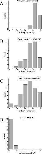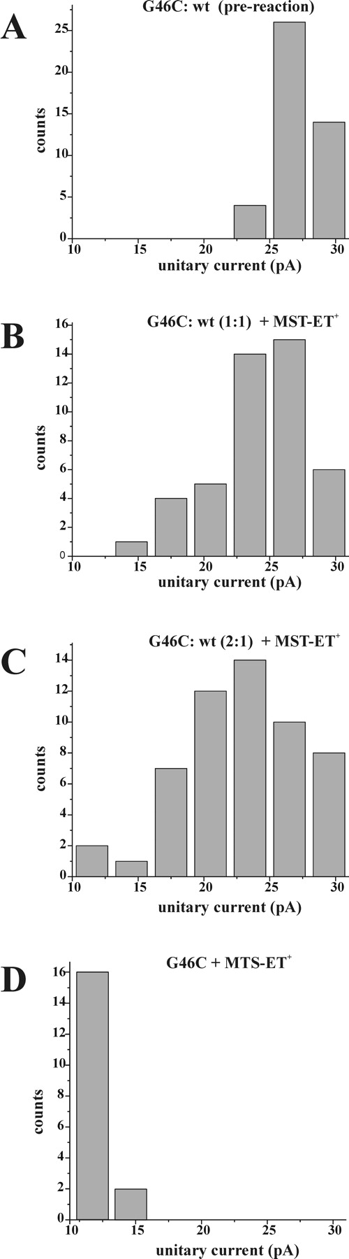 Figure 7. . Reductions in unitary conductance of G46C hemichannels by MTS-ET+ results from modification of all six subunits. In all plots, counts represent the number of hemichannels whose conductance falls within the bin width shown. All currents were measured as the chord conductance at -70 mV in symmetric IPS solution. (A) Frequency distribution of single hemichannel current amplitudes of oocytes coinjected with G46C and wtCx46 cRNAs. No differences were observed between oocytes injected with 1:1 and 2:1 ratios (G46C:wt) and the data are pooled together. (B) Frequency distribution of single-hemichannel current amplitudes of oocytes coinjected with G46C and wtCx46 cRNAs in a 1:1 ratio and treated with 1 mM MTS-ET+. (C) Frequency distribution of single hemichannel current amplitudes of oocytes coinjected with G46C and wtCx46 cRNAs in a 2:1 ratio and treated with 1 mM MTS-ET+. (D) Frequency distribution of single hemichannel current amplitudes of oocytes injected only with G46C cRNA and treated with 1 mM MTS-ET+.
