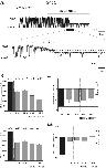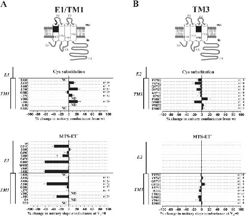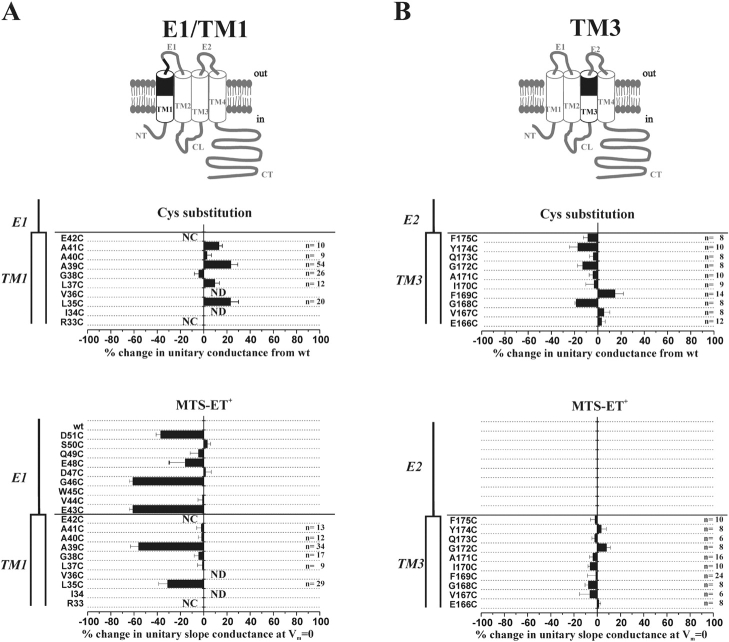 Figure 8. . SCAM with MT-SET+ shows continued reactivity in TM1 and no evidence of reactivity in the topologically corresponding segment of TM3. Effects of Cys substitutions for TM1 residues E42 through R33 (A) and TM3 residues F175 through E166 (B). Solid horizontal lines indicate E1/TM1 and E2/TM3 borders according to Bennett et al. (1991). The change in unitary conductance represents the mean percentage change in the slope conductance compared with wt Cx46 measured at Vm = 0 from fitted open channel I-V relations. In general, Cys substitutions in TM1 produced increases in conductance, whereas in TM3 there was no obvious pattern. In TM1, E42C and R33C failed to form functional hemichannels and single channels were not observed from oocytes injected with V36C and I34C due to consistently low expression levels. In TM3, all Cys mutants formed functional hemichannels. Below the Cys-substitution data, SCAM results are summarized for residues D51 through R33 (A) and residues F175 through E166 (B), which span the regions shaded in black in the corresponding illustrations of connexin subunits. In TM1, large reductions in conductance with MTS-ET+ were observed at two positions, A39C and L35C. No substantial changes in conductance were observed at any position in TM3. For all mutants, the change in unitary conductance represents the mean percentage change in the slope conductance relative to the corresponding Cys substituted mutant measured at Vm = 0 from fitted open channel I-V relations. Data from excised patches of either configuration showed no differences and are pooled together with cell-attached recordings of prereacted oocytes. NC denotes nonfunctional hemichannels. ND denotes residues for which there was insufficient single-channel data for characterization.