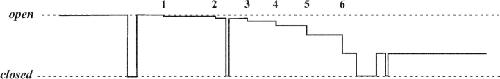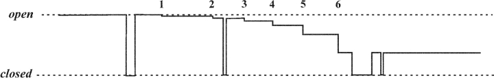 Figure 10. . Schematic of an idealized single-channel current showing the proposed pattern of subunit modification that occurs with MTS-ET+. The lower dashed line indicates the fully closed state (closed) and the upper dashed line the open state before application of MTS-ET+ (open). We envision six step changes in conductance (indicated by the numbers) in the pattern shown, each representing a reaction at an individual subunit. The subunit reactions become progressively larger such that the first one is small and the last one constitutes nearly 40% of the total conductance change. The latter subunit modifications are large enough to be observed as discrete step changes in current, whereas the initial modifications are likely obscured by the open channel noise.