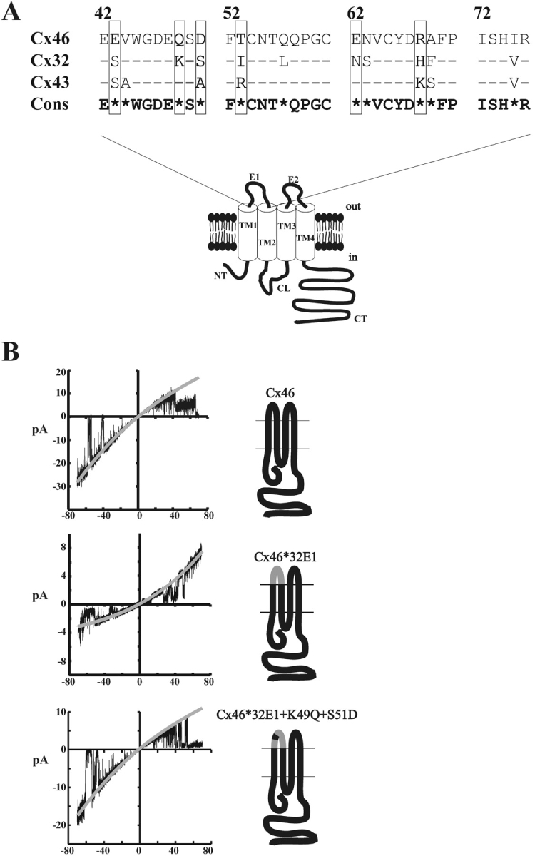 Figure 1. . Residues in E1 of Cx46 near the TM1 border of Cx46 are important for the effects caused by the Cx46*32E1 substitution. (A) Sequence comparison of E1 domains of Cx46, Cx32, and Cx43. The accepted topology of a connexin subunit has four transmembrane (TM) domains, extracellular E1 and E2 loops, and cytoplasmic NH2-terminal (NT), loop (CL), and carboxy terminal (CT) domains. E42 resides at the TM1/E1 border and R76 at the E1/TM2 border. (B) Representative recordings of Cx46, Cx46*32E1, and Cx46*32E1(K49Q + S51D) hemichannel currents in Xenopus oocytes obtained with 8-s voltage ramps from −70 to +70 mV applied to cell-attached patches containing single hemichannels. The solid gray lines represent exponential fits to the open-state current. Substitution of the E1 domain of Cx32 into Cx46 (Cx46*32E1) substantially reduced unitary conductance and converted open-channel current rectification from inward to outward. Restoring the residues at positions 49 and 51 in the Cx46*32E1 chimera back to Cx46 sequence largely restored wild-type Cx46 properties.