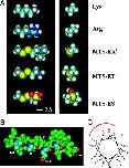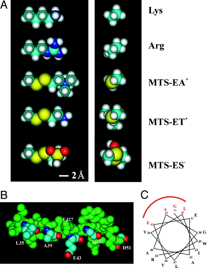 Figure 9. . Reactivity between L35 and G46 follows an α-helical pattern. (A) Space-fill models comparing side chains of residues composed of Lys, Arg, and Cys modified by MTS-EA+, MTS-ET+, and MTS-ES−. The color code for atoms is H (white), C (cyan), N (blue), O (red), and S (yellow). Left and right panels show views along and down the long-axes of the side chains, respectively. (B) Space-fill α-helical representation of residues R33 through D51 of Cx46. Residues assigned to the pore are shown in color. All other residues are in green. With the exception of D51C, reacted residues fall along one face of the helix suggesting a departure from an α-helical transmembrane secondary structure in the E1/TM1 border region. (C) Helical wheel representation of residues R33 through G46 of Cx46. Reacted residues (red) reside on one side subtending an arc of ∼80 degrees. For A and B the models were generated using Hyperchem, release 3 (Hypercube, Inc.).