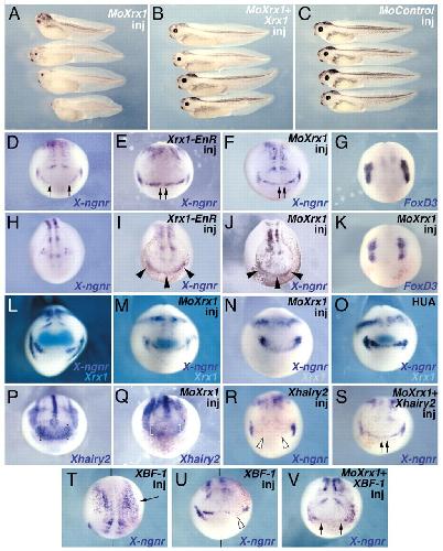Fig. 8. Effects of Xrx1 loss of function on genes regulating anterior neurogenesis. (A-C) Phenotypes of stage 41 embryos injected with MoXrx1 (A), MoXrx1 and Xrx1 (B), and control morpholino oligo (C). (F,J,K,M,N,Q) Embryos injected with MoXrx1 in both dorsoanimal blastomeres at the eight-cell stage and analyzed at stage 14 (F,K,M,N,Q) and stage 18 (J). (D,G,H,L,P) Control uninjected embryos analyzed at stage 14 (D,G,L,P) and stage 18 (H). (E,I) Embryos bilaterally injected with Xrx1-EnR analyzed at stage 14 (E) and stage 18 (I). (O) Stage 14 embryo treated with HUA. (R,S,V) Stage 14 embryos bilaterally injected with Xhairy2 (R), MoXrx1 and Xhairy2 (S), and MoXrx1 and XBF-1 (V). (T,U) Dorsal (T) and frontal (U) views of a stage 14 embryo injected with XBF-1. Red staining represents co-injected lacZ. Black brackets indicate the size of the anterior expression domain in the uninjected embryo (P); white brackets indicate the size of the corresponding domain in the injected embryo (Q). Arrows in D,E,F,S,V indicate the anterior boundaries of X-ngnr-1 expression; the arrow in T indicates X-ngnr-1 ectopic expression. Black arrowheads in I,J indicate the continuous anterior extension of X-ngnr-1 expression. White arrowheads in U and R indicate the repressed anterior expression domain of X-ngnr-1.