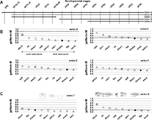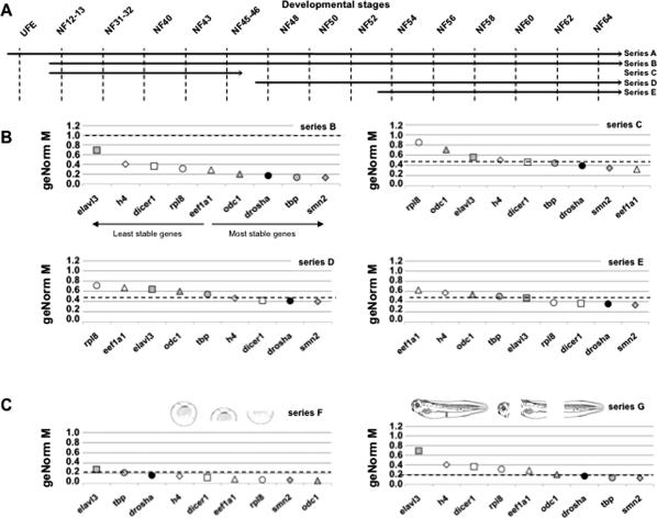 BACKGROUND: Accurate interpretation of transcriptome profiling by quantitative PCR requires the establishment of species-specific standards. However, the selection of reference genes for assessing RNA expression profiles in Xenopus laevis and Xenopus tropicalis was mostly based on historical reasons and they often only reflect the traditions of a laboratory. RESULTS: We investigated the expression stability of 10 genes (dicer1, drosha, eef1a1, elavl3, gsc, h4, odc1, rpl8, smn2, tbp), 8 of which are commonly used as internal controls in published RT-qPCR experiments. We defined specific primer pairs and evaluated their suitability as reference genes by performing RT-qPCR expression profiling in Xenopus tropicalis. Gene expression stability was assayed in a set of 15 developmental stages from the egg to the froglet, and in dissected embryos. CONCLUSIONS: Overall, we determined a set of qualified reference genes for distinct developmental periods. We recommend the use of dicer1, drosha, eef1a1, and smn2 from early embryonic development up to the end of metamorphosis. During early embryogenesis drosha, eef1a1, smn2 are suitable. For the whole post-embryonic development and for metamorphic stages including pro-metamorphosis and metamorphic climax, we recommend the use of drosha and smn2. These reference genes should prove their usefulness for data comparison across studies.