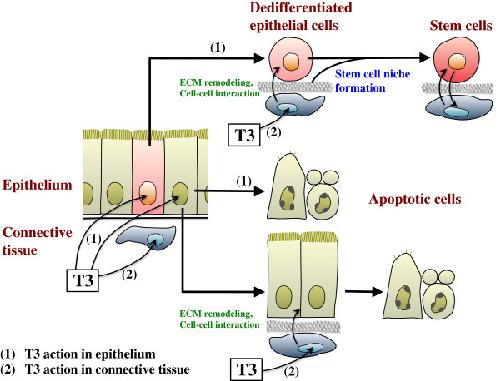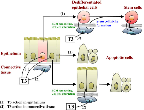 Figure 2. A model for T3 actions for the metamorphic transformation of Xenopus laevis intestine. During metamorphosis, T3 acts directly (1) on the larval epithelium as well as (2) on the rest of the intestine (the non-epithelium), mostly the connective tissue. Most of the larval epithelial cells are induced to undergo programmed cell death by either one of the two T3 actions: T3-induced cell autonomous apoptosis vs. apoptosis induced by ECM remodeling and cell-cell interaction due to T3 action in the non-epithelium. On the other hand, a small number of cells within the larval epithelium undergo dedifferentiation upon receiving the T3 signal. However, T3 action in these cells alone cannot induce the formation of adult stem cells, unless T3 action in the non-epithelium is also present. This suggests that T3-induced tissue interactions are required for the establishment of the stem cell niche, via ECM remodeling and cell-cell interaction, to enable the dedifferentiated epithelial cells to become stem cells. See [100] for details. |