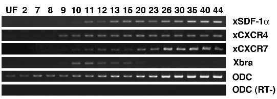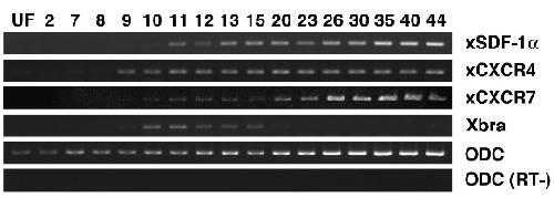 Fig. 1. Expression of xSDF-1a, xCXCR4 and xCXCR7. RT-PCR analysis of xSDF-1a, xCXCR4, and xCXCR7. Numbers show the developmental stage of each lane. UF is unfertilized egg. xCXCR4 and xCXCR7 transcripts increased at the late blastula stage (St. 9) and xSDF-1a was detected at the early gastrula stage (St.10). Xbra (Xenopus brachyury) was a stage marker and ODC (ornithine decarboxylase) was a loading control.