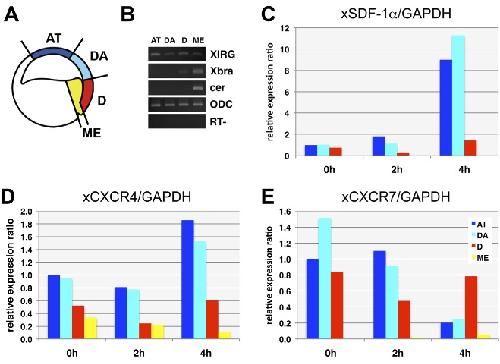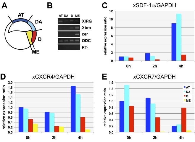 Fig. 4. qRT-PCR analysis of separated explants. (A) Schematic diagram of the separation. Animal top (AT, blue), dorsoanimal (DA, light blue), dorsal marginal (D, red), mesendoderm (ME, yellow) explants were separated at stage 10 gastrula. (B) Explant separation was confirmed by RT-PCR using maker genes indicated in the panel as XIRG for BCR, Xbra for pan-mesoderm, and Cer for mesendoderm. ODC was used as a loading control. (C,D,E) qRT-PCR analysis of xSDF-1a, xCXCR4, and xCXCR7 expression, respectively. Total RNA was extracted from the explants 0h, 2h, and 4h after separation corresponding to early (st. 10), middle (st. 11), and late (st. 12) gastrula, respectively. Vertical axis shows the ratio of relative expression level normalized by xGAPDH expression to that for AT explant at 0h. Each column in graph is the same color as in (A). Experiment was performed twice and showed a similar tendency.