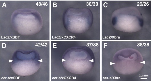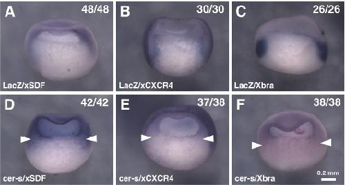 Fig. 5. Distribution of xCXCR4 and xSDF-1a transcripts in cer-s express- ing embryos Upper panels (A-C) show control LacZ-injected embryos and lower panels (D-F) are cer-s-injected embryos at stage 11. xSDF-1a (A,D), xCXCR4 (B,E), and Xbra (C,F) were used asWISH probes. Dark blue staining shows probes stained with BM purple. Arrowheads show mesendodermal regions. Numbers are embryos with the same expression pattern to total number of embryos used for the experiment. Scale bar, 0.2 mm.