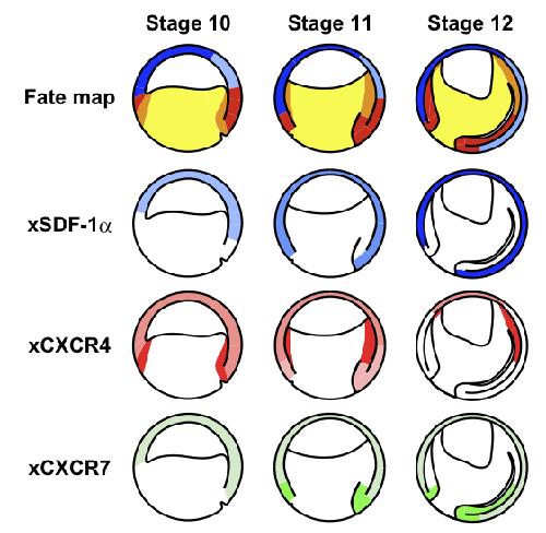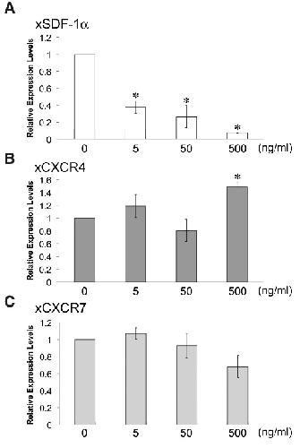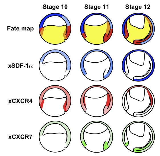 Expression of xSDF-1α, xCXCR4, and xCXCR7 during gastrulation in Xenopus laevis.