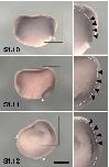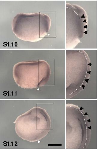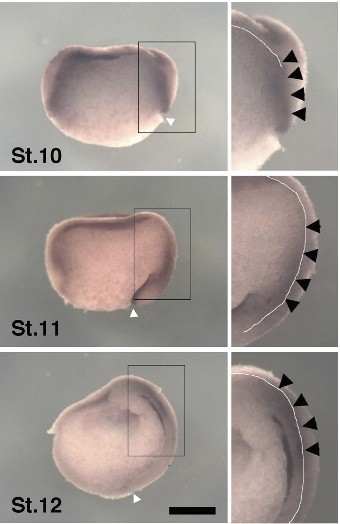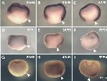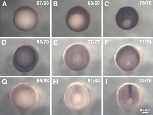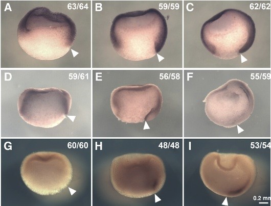 Fig. 2 (left). External view of the expression patterns of xSDF-1a, xCXCR4 and xCXCR7. xSDF-1a, xCXCR4 and xCXCR7 transcripts were examined by WISH in gastrula stage embryos. Panels show the results of probes using xSDF-1a (A-C), xCXCR4 (D-F), xCXCR7 (G-I) in stage 10 (A,D,G), stage 11 (B,E,H), and stage 12 (C,F,I) embryos. Embryos are vegetal view, dorsal side up. Dark blue staining shows signals of probes stained with BM purple. Numbers showing embryos with the same expression pattern to total number of embryos used for the experiment. Scale bar, 0.2 mm.
