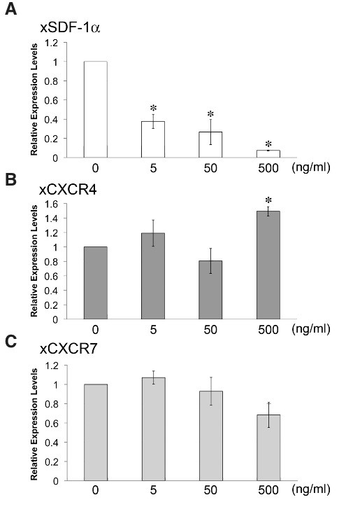 Fig. 6. qRT-PCR analysis of activin-treated explants. Animal cap explants were treated with 5, 50, and 500 ng/ml activin A at stage 8.5. Expression levels of xSDF-1a (A), xCXCR4 (B), and xCXCR7 (C) were quantified by real-time RT-PCR. Vertical axis shows the ratio of relative expression level normalized by xGAPDH expression to that for the untreated explant. Results are the mean of three independent experiments, and error bars indicate the SE. Differences between means in no treatment (0 ng/ml) and each activin treatment were assessed with Student t-test. Asterisks (*) indicate p <0.01.