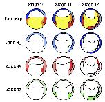 Fig. 7. Schematic diagram of the fate map of Xenopus gastrula and expression patterns of xSDF-1a, xCXCR4 and xCXCR7. Diagrams in top row show the fate map of sagittal section of gastrulaembryo stages from 10 to 12 and colors in diagrams indicate mesendoderm (orange), involut- ing mesoderm (red), presumptive neural tissue (light blue), and future epidermis (blue). Diagrams below are expression patterns of xSDF-1a (blue), xCXCR4 (red), and xCXCR7 (green) in stages corresponding with the fate map, respectively. Concentration of each color in the expression patterns corresponds to the predicted amount of expression of each mRNA examined by WISH and qRT-PCR analyses.