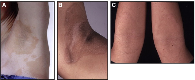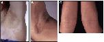 Fig. 3. Erythrokeratoderma variabilis (EKV). Red/brown hyperkeratotic lesions on the trunk and limbs (A–C). Patient harbours the Cx30.3 mutation p.R98L, of unknown clinical significance (A). Patient has the Cx30.3 mutation p.M190L (B and C).