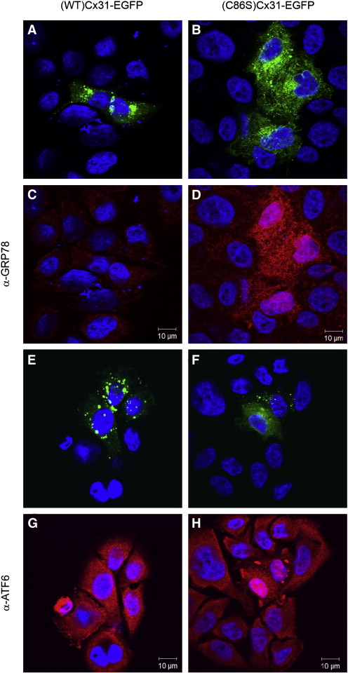Fig. 4. Expression of the Cx31 EKV-causing mutant upregulates components of the unfolded protein response (UPR) pathway. The UPR components BiP/GRP78 (C and D) and ATF6 (G and H) are upregulated in HeLa cells overexpressing the mutant (C86S)Cx31-EGFP (D and H) but not the wild-type construct (WT)Cx31-EGFP (C and G). Furthermore, the ATF6 staining (H) has a more nuclear localisation in cells expressing (C86S)Cx31-EGFP compared to untransfected cells and cells expressing (WT)Cx31-EGFP, indicating that the cleaved amino-terminal portion has been translocated to the nucleus. The DAPI-stained nuclei are shown in blue.