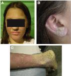 Fig. 2. Keratitis–ichthyosis–deafness (KID) syndrome. Rugose hyperkeratosis on the lower face (A), verrucous hyperkeratosis on the ear lobe (B) and extensive hyperkeratosis on the distal limbs and plantar surface of the feet (C) in a patient with the Cx26 mutation p.D50N.