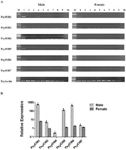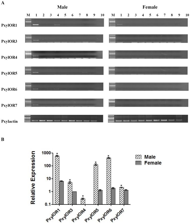 Figure 3. Tissue specificity and expression pattern of six candidate pheromone receptors amplified in male and female moth.(A) tissue specificity of PxylOR1 and 3–7; M is D2000 marker (Tiangen), 1 is antennae, 2 is heads (without antennae), 3 is proboscis, 4 is labial palps, 5 is genitals, 6 is throats, 7 is abdomens, 8 is legs and 9 is wings, 10 is negative control. (B) Relative expression quantity of six candidate pheromone receptors amplified in male and female antennae. The x-axis shows the candidate pheromone receptors in male and female moths, the Y-axis indicates relative expression quantity (mean+standard error of mean). The expression of female PxylOR3 is taken as the reference standard.