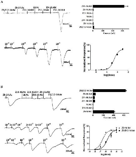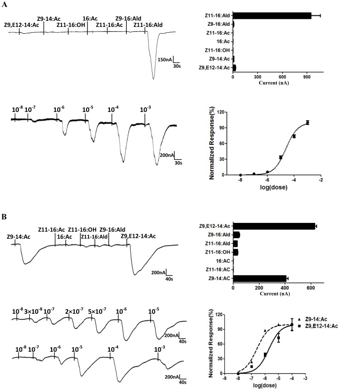 Figure 4. Responses of Xenopus oocytes with co-expressed PxylOR1/PxylOrco or PxylOR4/PxylOrco to stimulation with pheromone compounds.(A) (Upper left) Inward current responses of PxylOR1/PxylOrco Xenopus oocytes in response to 10−4 M of pheromone compounds and analogs. (Upper right) Response profile of PxylOR1/PxylOrco Xenopus oocytes. Error bars indicate SEM (n = 6). (Lower left) PxylOR1/PxylOrco Xenopus oocytes stimulated with a range of Z11-16: Ald concentrations. (Lower right) Dose–response curve of PxylOR1/PxylOrco Xenopus oocytes to Z11-16:Ald. Responses are normalized by defining the maximal response as 100%. Z11-16: Ald EC50 = 2.39×10−5 (n = 5). Error bar indicates SEM. (B) (Upper left) Inward current responses of PxylOR4/PxylOrco Xenopus oocytes in response to 10−4 M of pheromone compounds and analogs. (Upper right) Response profile of PxylOR4/PxylOrco Xenopus oocytes. Error bars indicate SEM (n = 7). (Lower left) PxylOR4/PxylOrco Xenopus oocytes stimulated with a range of pheromone Z9-14: Ac and analog Z9, E12-14: Ac concentrations, respectively. (Lower right) Dose–response curve of PxylOR4/PxylOrco Xenopus oocytes to Z9-14: Ac and Z9, E12-14: Ac. Responses are normalized by defining the maximal response as 100%. Z9-14: Ac EC50 = 2.43×10−7 (n = 7) and Z9, E12-14: Ac EC50 = 1.94×10−6 (n = 5). Error bar indicates SEM.