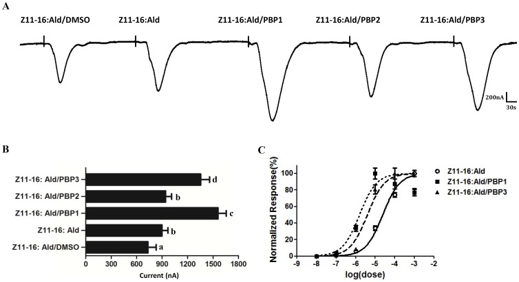 Figure 6. PBP-mediated responses of PxylOR1/PxylOrco Xenopus oocytes.(A) Inward current responses of PxylOR1/PxylOrco Xenopus oocytes in response to 10−5 M of Z11-16: Ald solubilized by DMSO, 1XRinger, or each of three PxylPBPs, respectively. (B) Response profile of PxylOR1/PxylOrco Xenopus oocytes. Error bars indicate SEM (n = 5). Statistical comparison of responses of oocytes was assessed using one-way analysis of variance (ANOVA). (C) Dose–response profile of PxylOR1/PxylOR2Xenopus oocytes upon stimulation with different Z11-16: Ald concentrations solubilized by DMSO (n = 5), 1 µM PxylPBP1 (n = 4) and 1 µM PxylPBP3 (n = 4), respectively. Responses are normalized by defining the maximal response as 100%. Error bar indicates SEM.