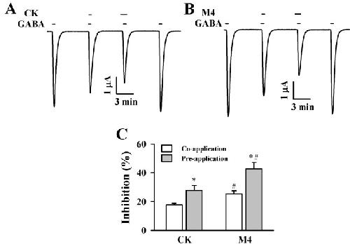Fig. 2. Effect of CK and M4 on IGABA in oocytes expressing the ρ1 GABAC receptor. (A) GABA (2 µM) was first applied and then was co- or pre-treated with CK (100 µM). Co-treatment of CK with GABA and pre-treatment of CK before GABA application inhibited IGABA in oocytes expressing ρ1 GABAC receptors. (B) GABA (2 µM) was first applied and then co- or pre-treated with M4 (100 µM). Co-treatment of M4 with GABA and pre-treatment of M4 before GABA application inhibited IGABA in oocytes expressing ρ1 GABAC receptors. The resting membrane potential of oocytes was approximately -35 mV and oocytes were voltage clamped at a holding potential of -80 mV prior to drug application. Traces are representative of 8~12 separate oocytes from 3 different frogs. (C) Summary of percent inhibition by CK and M4 of IGABA calculated from the average of the peak inward current elicited by GABA alone before CK and M4 and the peak inward current elicited by GABA alone after co- and pre-treatment of CK and M4 with GABA. Each point represents the mean±S.E.M. (n=9~12 from 3 different frogs). *p <0.05 as compared to co-treatment of CK and M4, and #p<0.05 as compared to CK.