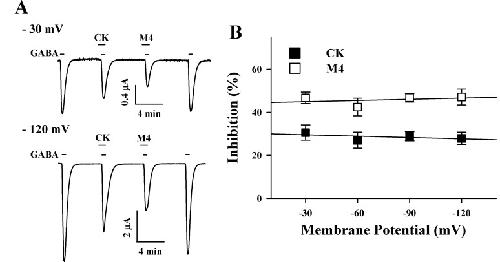 Fig. 4. Voltage-independent inhibition by CK and M4. (A) GABA (2 µM) was first applied and pre-treatment of CK (100 µM) or M4 (100 µM) before GABA application inhibited IGABA in oocytes expressing ρ1 GABAC receptors. The inhibitory degrees were very similar at -30 mV and -120 mV of membrane potential. (B) Voltage-independent inhibition of IGABA in GABAC receptors by CK and M4. Values were obtained from the receptors in the absence or presence of 100 µM CK and M4 at the indicated membrane holding potentials. The observed effects of CK and M4 were correlated with membrane potential. No significant effects were noted for CK (r2=0.28, p>0.31) and M4 (r2=0.10, p>0.44).