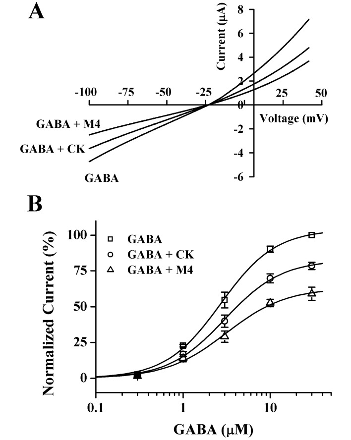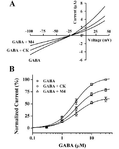 Fig. 5. Current-voltage relationships and concentration-dependent effects of GABA on CK- and M4-mediated inhibition of IGABA. (A) Current-voltage relationships of IGABA inhibition by CK and M4 in GABAC receptors. Representative current-voltage relationships were obtained using voltage ramps of -100 to +40 mV for 300 ms at a holding potential of -80 mV. Voltage steps were applied before and after application of 2 µM GABA in the absence or presence of 100 µM CK and M4. (B) Concentration-response relationships for GABA in GABAC receptors with GABA applied (0.3~30 µM) alone or with GABA plus pre-treatment of 100 µM CK and M4 before GABA application. IGABA of oocytes expressing the GABAC receptors was measured using the indicated concentration of GABA in the absence (□) or presence (○) of 100 µM CK or presence (△) of 100 µM M4. Oocytes were voltage-clamped at a holding potential of -80 mV. Each point represents the mean±S.E.M. (n=8~12/group).