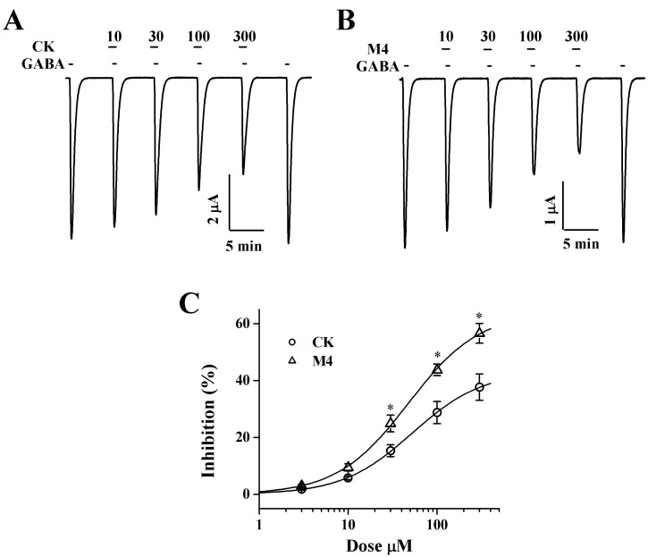 Fig. 3. Concentration-dependent effects of CK and M4 on IGABA in oocytes expressing ρ1 GABAC receptors. (A, B) The trace shows that CK and M4 inhibited the currents elicited by GABA (GABA; 2 µM) in a dose-dependent manner. (C) Percent inhibition by CK and M4 of IGABA was calculated from the average of the peak inward current elicited by GABA alone before CK and M4 and the peak inward current elicited by GABA alone after pre-treatment of CK and M4 before GABA. The continuous line shows the curve fitted according to the equation. Each point represents the mean±S.E.M. (n=9~12 from 3 different frogs). *p<0.005 as compared to CK.