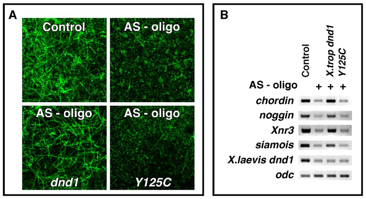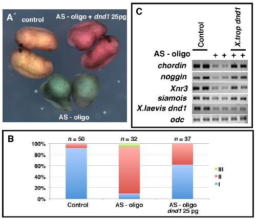 Fig. 2. Specificity of Dnd1 knockdown. (A) Morphology of uninjected control (brown), AS-oligo-injected (blue), and AS-oligo- and tropicalis dnd1-injected (red) embryos at stage 25. (B) Summary of experiments shown in A. (C) RT-PCR results showing the expression of noggin, chordin, Xnr3, siamois and dnd1 in control, AS-oligo-injected, and AS-oligo- and tropicalis dnd1-injected (rescued) embryos at stage 10.5.