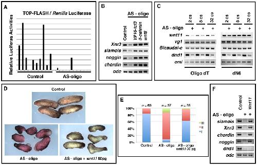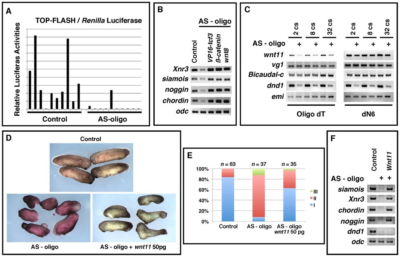 Fig. 3. Maternal Dnd1 is required for the initiation of maternal Wnt signaling during axis specification. (A) TOP-Flash luciferase assay measuring maternal Wnt signaling activities in control and Dnd1-depleted embryos (two embryos each group). Host-transfer embryos were injected with a mixture of TOP-Flash and pRL-SV40 and harvested at stage 9.5. Firefly luciferase activity was normalized to that of Renilla luciferase. (B) RT-PCR showing that overexpression of VP16-tcf3 (10 pg), β-catenin (100 pg) and wnt8 (5 pg) rescued the expression of noggin, chordin, Xnr3 and siamois in Dnd1-depleted embryos at stage 10.5. VP16-tcf3, β-catenin and wnt8 were injected at the four-cell stage into the marginal zone of two blastomeres of Dnd1 knockdown embryos. (C) Depletion of maternal Dnd1 impaired polyadenylation of wnt11. Total RNAs were reverse transcribed with oligo dT (left) and random hexamers (dN6, right). RT-PCR was performed to measure the expression of wnt11, vg1, Bicaudal-c, dnd1 and emi1. (D) Morphology of control (brown, top), AS-oligo-injected (red, lower left), and AS-oligo- and wnt11-injected (50 pg) (blue, lower right) embryos. (E) Summary of the phenotypes observed in the Wnt11 rescue experiments. (F) RT-PCR results showing that overexpression of Wnt11 rescued the expression of noggin, chordin, Xnr3 and siamois in Dnd1 knockdown embryos at stage 10.5.