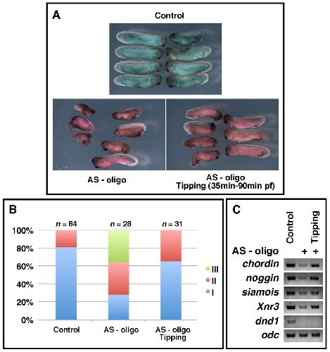 Fig. 5. Dorsal determinants remain intact in dnd1-depleted embryos. (A) Morphology of uninjected control embryos (top), dnd1-depleted embryos (AS-oligo, lower left), and dnd1-depleted embryos that were tipped 90 degrees relative to the animal-vegetal axis during the first embryonic cell cycle (lower right). (B) Summary of the phenotypes of the tipping experiment. (C) RT-PCR showing that tipping dnd1-depleted embryos during the first embryonic cell cycle rescued the expression of noggin, chordin, Xnr3 and siamois in Dnd1 knockdown embryos at stage 10.5.