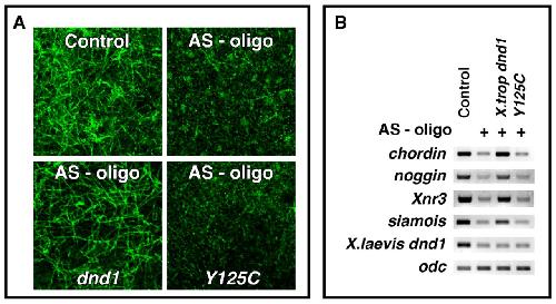Fig. 6. The RNA-binding activity of Dnd1 is required for its function during vegetal cortical microtubule assembly in activated eggs and dorsal development in fertilized eggs. (A) Confocal images showing the formation of vegetal cortical microtubules in uninjected control (upper/left), AS-oligo-injected (upper/right), AS-oligo- and dnd1-injected (lower/left), and AS-oligo- and Y125C-injected (lower/right) eggs (40 minutes post-needle-pricking). Fixed eggs were bisected and the vegetal halves were stained with an anti-Tubulin antibody. (B) RT-PCR showing that overexpression of the wild-type dnd1, but not Y125C, rescued the expression of noggin, chordin, Xnr3 and siamois in Dnd1 knockdown embryos (stage 10.5).