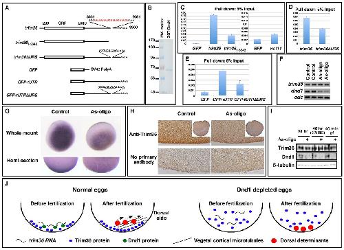 Fig. 7. Dnd1 binds trim36 directly and anchors trim36 to the vegetal cortex. (A) Schematic of trim36 deletion constructs used in the in vitro pull-down assay. (B) Coomassie Blue staining showing purified GST-Dnd1 protein used in the pull-down assay. (C-E) Real-time RT-PCR showing the ratio between RNAs associated with GST-Dnd1 protein and 5% of RNA input. (C) GST-Dnd1 efficiently pulled down trim36, but not GFP or wnt11. (D) Mutation of the URS in trim36 reduced the binding of trim36 by GST-Dnd1. (E) Fusing the 3â²-UTR of trim36 to GFP increased the binding of GST-Dnd1 to GFP RNA. (F) RT-PCR showing that knockdown of Dnd1 had no effect on the level of trim36 mRNA in eggs. (G) In situ hybridization showing that trim36 is no longer localized to the vegetal cortex in dnd1-depleted eggs. (H) Immunohistochemistry showing that knockdown of Dnd1 interfered with the accumulation of Trim36 protein in the vegetal cortex of eggs. Inserts at lower magnification show whole eggs. (I) Immunoprecipitation/western blotting showing that the level of Trim36 protein remained unchanged in Dnd1 depleted eggs. Protein lysates from 50 oocytes or eggs were incubated first with an anti-Trim36 antibody to immunoprecipitate Trim36. Supernatants were then incubated with an anti-Dnd1 antibody to pull down Dnd1. (J) Model of Dnd1 function at the vegetal pole. Dnd1 anchors trim36 within the vegetal cortex resulting in localized translation and vegetal accumulation of Trim36. Trim36 promotes vegetal microtubular array formation required to move and thus activate the dorsal determinants. Without Dnd1, trim36 localization is disrupted, Trim36 protein is diluted, microtubular arrays do not form; dorsal determinants remain inactive at the vegetal pole.