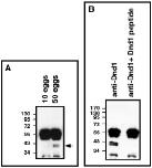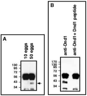Fig. S2. Specificity of anti-Dnd1 antibody. (A) Western blot showing detection of the endogenous Dnd1 by the affinity-purified anti-Dnd1 antibody. Endogenous Dnd1 was enriched by immunoprecipitation from 10 and 50 eggs, respectively. Immunoprecipitation samples were separated on 10% SDS-PAGE and probed with the anti-Dnd1 antibody. (B) Western blot showing that endogenous Dnd1 was detected by anti-Dnd1 antibody, but not by the antibody that had been pre-absorbed with the Dnd1 peptide.