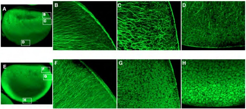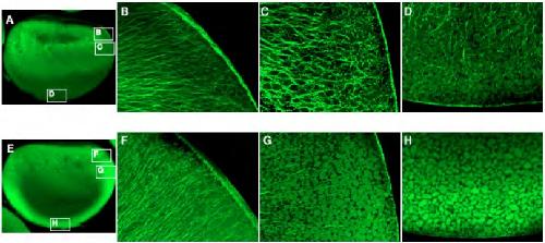 Fig. S3. Microtubule formation. Confocal images showing microtubule formation in control (A-D) and Dnd1 depleted (E-H) embryos. Embryos were harvested at 40 minutes post-fertilization. B-D and F-H are higher magnification views of the boxed areas in A and E, respectively.