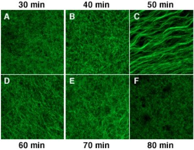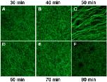 Fig. S4. Vegetal cortical microtubule dynamics in artificially activated eggs. Oocytes were treated with progesterone to induce maturation. After GVBD, eggs were pricked with a glass needle. Activated eggs were harvested at 30 (A), 40 (B), 50 (C), 60 (D), 70 (E) and 80 (F) minutes post-pricking, and stained with an anti-Tubulin antibodies. The formation of vegetal cortical microtubules was assessed by confocal microscopy.