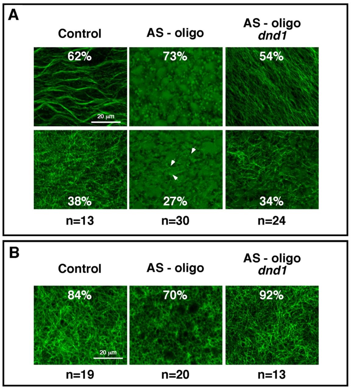 Fig. 4. Maternal Dnd1 is required for vegetal cortical microtubule assembly. (A,B) Confocal images showing the formation of vegetal cortical microtubules in fertilized eggs (A, 55 minutes post-fertilization; top and bottom figures) and in artificially activated eggs (B, 40 minutes post-needle pricking). Fixed eggs were bisected and the vegetal halves were stained with an anti-Tubulin antibody. Formation of vegetal cortical microtubules was severely disrupted in all Dnd1 knockdown fertilized eggs. In 27% of Dnd1 knockdown fertilized eggs (A, lower middle), a few microtubules were detected (indicated by arrows). Also note that at 40 minutes post-needle pricking, disordered microtubules just begin to polymerize into the vegetal cortex of activated eggs (supplementary material Fig. S4).