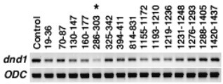 Fig. S1. Selection of antisense oligos for depletion of maternal dnd1. RT-PCR showing the effects of AS-oligos (10 ng) injection on the stability of endogenous dnd1 mRNA in oocytes.