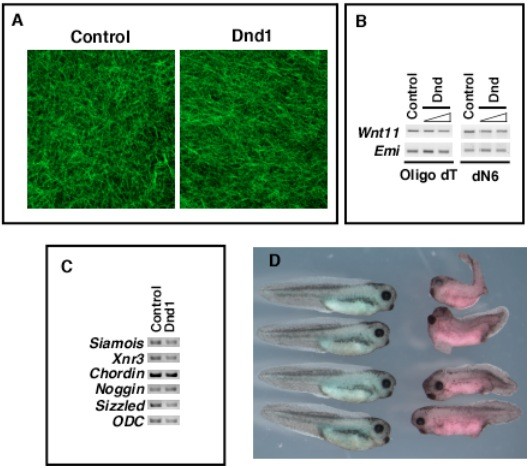 Fig. S5. Effects of Dnd1 overexpression. (A) Confocal images showing the formation of vegetal cortical microtubules in control and dnd1 (500 pg) overexpressed host-transfer embryos (45 minutes post-fertilization). (B) Effect of Dnd1 overexpression on wnt11 polyadenylation. Total RNA from control and Dnd1 overexpressed embryos (eight-cell stage) was reverse transcribed with oligo dT (left) and random hexamers (dN6, right). Oligo dT- and random-primed cDNAs were used as templates for PCR with wnt11 and Emi1 primers. (C) RT-PCR showing that overexpression of dnd1 (500 pg) had no detectable effect on the expression of dorsal genes. dnd1 RNA was injected into oocytes, allowed to translate and these oocytes were used for host transfer. Resulting embryos were harvested at stage 10.5 and analyzed for expression of noggin, chordin, Xnr3,siamois and sizzled. (D) Morphology of control (blue) and Dnd1-overexpressed host-transfer embryos (red).