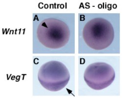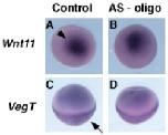 Fig. S6. Knockdown of maternal Dnd1 had no effect on vegetal localization of wnt11 or VegT. (A-D) Whole-mount in situ hybridization showing the expression of wnt11 (A,B) and VegT (C,D) in control (A,C) and AS-oligo injected (B,D) eggs. A and B are vegetal views. C and D are lateral views.
