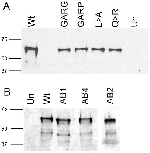 Figure 4. Mutant FoxD4L1 proteins are adequately expressed.Western blots of lysates from oocytes injected with mRNAs encoding C-terminus mutants (A) or Acidic Blob mutants (B) show expression of each mutant protein. Un, lysates from uninjected oocytes; Wt, lysates from wild-type FoxD4L1 injected oocytes.