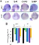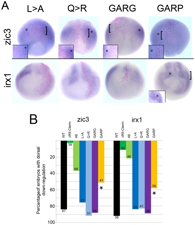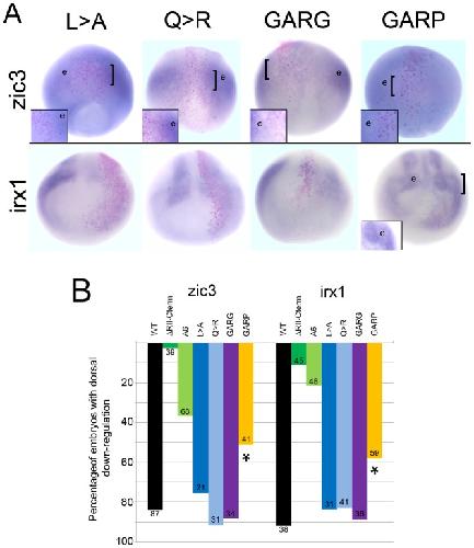 Figure 5. The ability to down-regulate zic3 and irx1 is lost in the GARP mutant.(A) The FoxD4L1 C-terminal mutant expressing clones, marked by nuclear β-Gal (pink dots), are located in the neural ectoderm. For L>A, Q>R and GARG mutants, the βGal labeled cells are less intensely stained (blue) than their neighboring cells (e) expressing endogenous levels of zic3 or irx1. For GARP, the βGal labeled cells are stained at the same intensity as the neighboring cells (e). Insets are higher magnifications of the clone, the position of which is indicated on the whole embryo by a bracket. For zic3, images are dorsal views with vegetal pole towards the bottom; for irx1, images are frontal views with dorsal towards the top. (B) The percentage of embryos in which the FoxD4L1 C-terminal mutants caused down-regulation of zic3 or irx1 in the dorsal neural ectoderm. Numbers on each bar indicates sample size; * indicates significant difference from wild type (WT) at the p<0.001 level. Data for WT, ΔRII-Cterm and A6 are from [39].