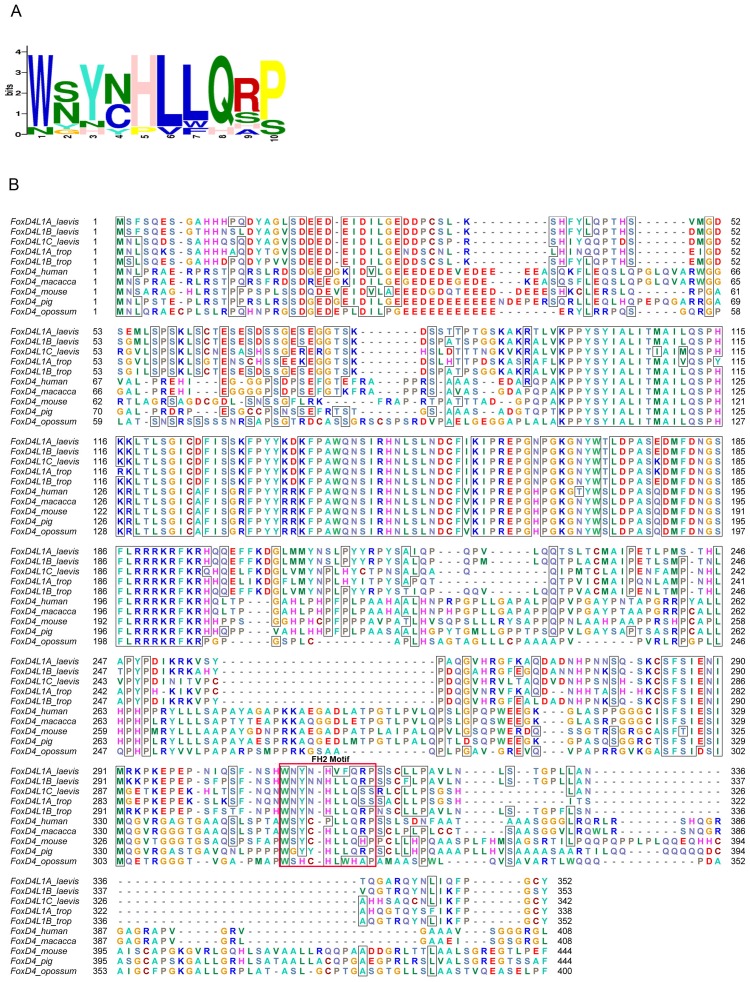 Figure 2. The C-terminus of FoxD4/FoxD4L1 from frog and mammals contains a novel specific conserved motif, which we term the Fox homology motif 2 (FH2).(A) The sequence logo of the 10 amino acid FH2 motif. (B) The FH2 motif is outlined in red on the FoxD4/FoxD4L1 sequence alignment.