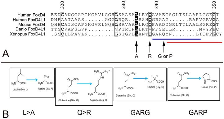 Figure 3. Conserved amino acids in the extreme C-terminus of FoxD4/FoxD4L1 proteins.(A) CLUSTALW alignment [64], viewed in ESPript [65], of the extreme C-terminal region of human FoxD4 (UniProtKB/Swiss Prot accession number Q12950), human FoxD4L1 (Q9NU39), mouse FoxD4 (Q60688), Danio FoxD4L1 (O73784) and Xenopus laevis FoxD4L1 (Q9PRJ8). The black boxes highlight identical amino acids, the light boxes highlight conserved amino acids and the bold letters indicate identical amino acids within a conserved region. The blue line denotes the amino acids in the Xenopus sequence predicted to form an α-helix, and the red line denotes Motif 6 (Fig. 1A). Arrows denote amino acid substitutions in the C-terminal mutants used in this study (L>A; Q>R; GARQ>GARG; GARQ>GARP). (B) Amino acid changes made in the C-terminal mutants used in this study.