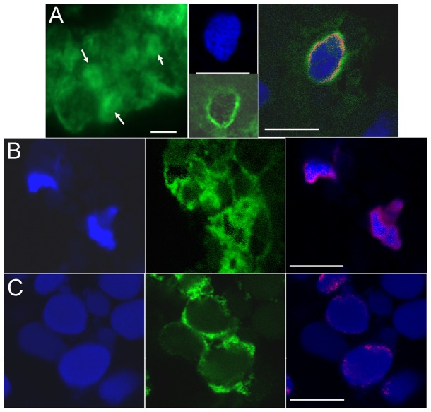 Figure 6. FoxD4L1 mutant proteins have access to the nucleus in a pattern similar to wild-type FoxD4L1.(A) Left panel: epifluorescence image of wild-type, myc-tagged FoxD4L1 protein in neural ectoderm of stage 13 embryo. Tagged protein is in the cytoplasm and in the nucleus (arrows). Middle panel: confocal image of a similar sample shows that the protein (green) is localized in the periphery of the nucleus (blue) where chromatin is concentrated in non-mitotic cells. Right panel: example from a similar sample in which a 32-channel signature spectral curve analysis was performed. Red pixels around the periphery of the nucleus represent sites of DNA (blue) and protein (green) colocalization. (B) Left panel: DAPI nuclear staining of cells in the superficial neural ectoderm of stage 12 embryo. Middle panel: Myc-tagged GARP protein (green), like wild-type protein, is found in the cytoplasm and in the periphery of the nucleus. Right panel: a 32-channel signature spectral curve analysis was performed to demonstrate with confidence nuclear localization of the tagged protein. Magenta pixels represent sites of DNA (blue) and protein colocalization. (C) Left panel: DAPI nuclear staining of cells in the deep layer of the stage 14 neural plate. Middle panel: Myc-tagged AB4 protein (green) also is found in the cytoplasm and in the periphery of the nucleus. Right panel: a signature spectral curve analysis was performed: magenta pixels represent sites of DNA (blue) and protein colocalization. White bars indicate 7 µm.