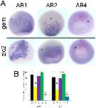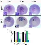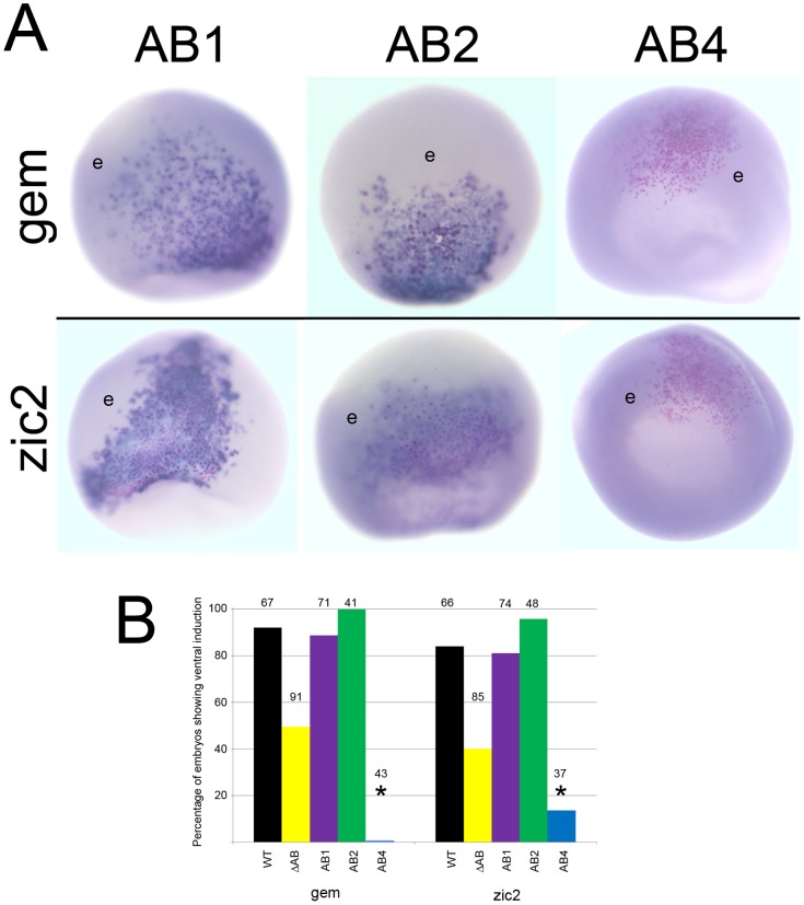 Figure 10. The ability to ectopically induce gem and zic2 is lost in the AB4 mutant.(A) Ventral ectopic expression of gem and zic2 after injection of each FoxD4L1-AB mutant mRNAs into an epidermal precursor blastomere. Clones are indicated by βGal-positive pink dots. In AB1 and AB2 clones, most cells exhibit a high level of expression (dark blue stain), compared to neighboring cells showing endogenous expression levels (e). Cells in the AB4 clones do not express the genes at levels above endogenous (e). gem-AB1, zic2-AB1, and zic2-AB2 are ventral views with animal cap to the bottom; gem-AB2, gem-AB4, zic2-AB4 are animal cap views. (B) The percentage of embryos in which the FoxD4L1-AB mutants induced gem or zic2 expression in the ventral ectoderm. Labeling is as in 9B.