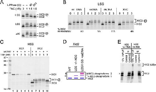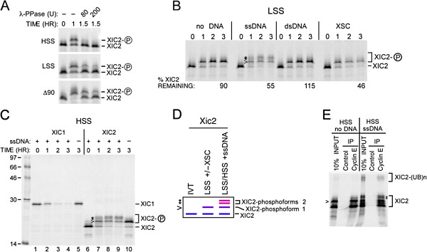 Figure 2. Xic2 is differentially phosphorylated in the absence and presence of single-stranded DNA. A. Xic2 phosphorylation shift assay. 35S-methionine labeled Xic2 was incubated in interphase egg extract (LSS or HSS) or mitotic extract (Δ90) as indicated in the absence (-) or presence of 80 or 200 units (U) of lambda phosphatase (λ-PPase). B. Xic2 phosphorylation shift and degradation assay. 35S-methionine labeled Xic2 was incubated in LSS with buffer (no DNA), single-stranded ΦX174 DNA (ssDNA, 10 ng/ul), pCS2+ plasmid DNA (dsDNA, 10 ng/ul), or XSC (10 ng/ul) at 23°C. Samples were analyzed by SDS-PAGE at 0-3 hrs. The mean percentage of remaining Xic2 from two independent experiments is shown (% Xic2 remaining) where the zero hour time point was normalized to 100%. C. Xic2 degradation assay. 35S-methionine labeled Xic1 or Xic2 was incubated in HSS with (+) or without (-) single-stranded DNA (ssDNA) for 0–3 hrs as indicated. Molecular weight markers are shown in kilodaltons. D. Schematic representation of 35S-methionine labeled Xic2 phosphoforms in the absence of extract or DNA (IVT) (left lane), in the presence of LSS with or without XSC (middle lane), or in the presence of LSS or HSS with ssDNA (right lane). Unphosphorylated Xic2 is marked by the blue line (XIC2), Xic2 phosphoform 1 is marked by the purple line and the caret (>), and Xic2 phosphoforms 2 are marked by the pink lines and the asterisks (*). E. Xic2 co-immunoprecipitation with cyclin E. 35S-methionine labeled Xic2 was incubated in HSS without (no DNA) or with (ssDNA) as indicated. Xic2 was co-immunoprecipitated (IP) with anti-cyclin E or control antibody. 10% of the input reaction is shown (10% INPUT). In all figures, “XIC2-P” or the caret (<) and asterisks (*) indicate the phosphoforms of Xic2 and ubiquitinated Xic2 protein bands are indicated as “XIC2-(UB)n”.