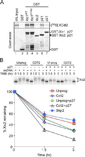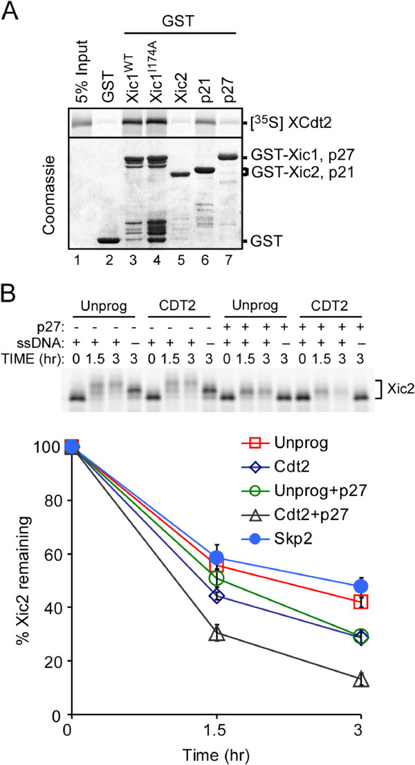 Figure 4. Cdt2 readily promotes Xic2 turnover in the presence of p27 CDK inhibitor. A. GST pull-down assay. GST alone or GST fused to wildtype Xic1 (Xic1WT), I174A mutant of Xic1 (Xic1I174A), Xic2, p21, or p27 (shown in coomassie gel shown in bottom panel) were bound to glutathione sepharose and incubated with in vitro translated 35S-methionine labeled Xenopus Cdt2 (XCdt2). 5% of the input XCdt2 is shown in lane 1 of the top panel (5% Input). B. Xic2 degradation assay. Top panel: 35S-methionine labeled Xic2 was incubated in HSS with (+) or without (-) 10 ng/ul ssDNA (ssDNA) in the presence (+) or absence (-) of p27, unprogrammed reticulocyte lysate (Unprog), or unlabeled in vitro translated Cdt2 (CDT2) for 0 to 3 hrs as indicated. Bottom panel: Graphic representation of Xic2 degradation. 35S-methionine labeled Xic2 was incubated in HSS with 10 ng/ul ssDNA and the percentage of Xic2 remaining was calculated for each sample where the zero hour time point was normalized to 100%. Reactions were supplemented with unprogrammed reticulocyte lysate (Unprog) (7 experiments), unlabeled in vitro translated Cdt2 (Cdt2) (7 experiments), unprogrammed reticulocyte lysate with p27 (Unprog+p27) (4 experiments), unlabeled in vitro translated Cdt2 with p27 (Cdt2+p27) (4 experiments), or unlabeled in vitro translated Xenopus Skp2 (Skp2) (3 experiments). Error bars (Standard error of the mean) are shown. P values were calculated by student t-test comparing each sample with the addition of unprogrammed reticulocyte lysate (Unprog). 1.5 hr p values: Cdt2 (0.000463), Unprog+p27 (0.270), Cdt2+p27 (0.00184), Skp2 (0.702). 3 hr p values: Cdt2 (0.00120), Unprog+p27 (0.0130), Cdt2+p27 (6.56E-05), Skp2 (0.306).