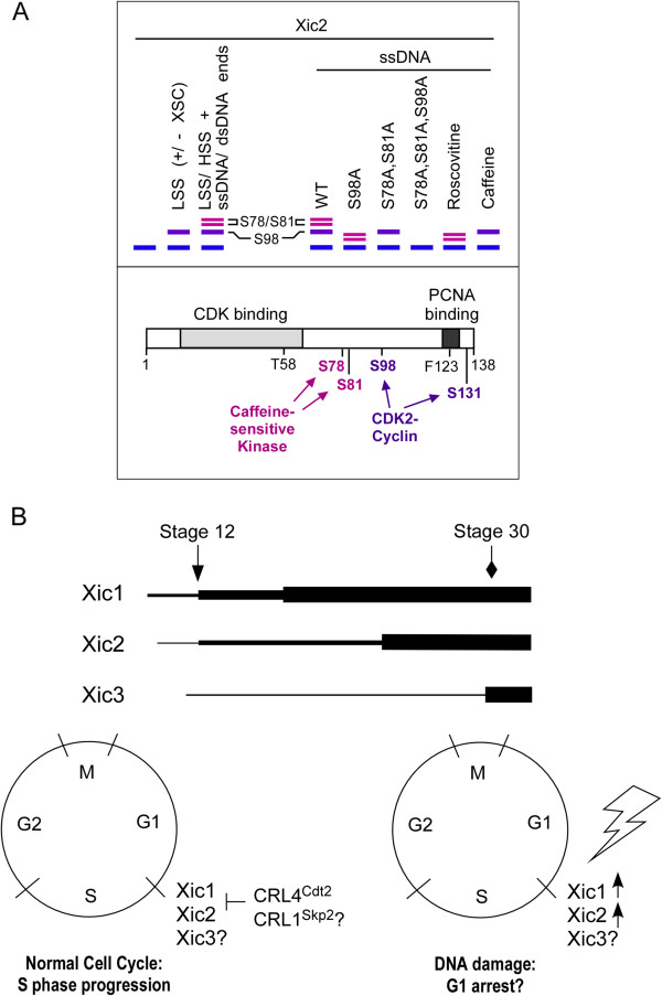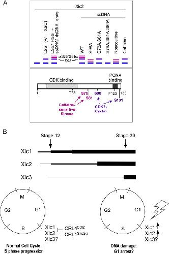 Figure 7. Idealized representation of Xic2 phosphoforms, developmental expression, and cell cycle regulation. A. Schematic representation of 35S-methionine labeled Xic2 wildtype and mutant protein bands or Xic2 under specific conditions (untreated, in extract, with DNA, or with kinase inhibitors) (top panel) and schematic representation of Xic2 phosphorylation sites targeted by CDK2-cyclin and a caffeine-sensitive kinase (bottom panel). Unphosphorylated Xic2 is marked by the blue line, S98 phosphorylated Xic2 is marked by the purple line, and S78/S81 phosphorylated Xic2 bands are marked by the pink lines. B. Top Panel: Schematic representation of Xic1, 2, 3 RNA/protein expression during Xenopus development where the thicker lines represent higher expression, the arrow indicates the timing of gastrulation (stage 12) and the diamond indicates the tailbud stage (30). Bottom panel: Xic1, 2, and 3 are predicted to function at the G1 to S phase transition during development and in a normal somatic cell cycle as shown in the drawing (left). It is predicted that Xic1 and Xic2 are targeted by CRL4Cdt2 and CRL1Skp2 ubiquitin ligases. During a response to DNA damage caused by IR (right), both Xic1 and Xic2 are predicted to be upregulated to halt the cell cycle in G1 during a checkpoint to allow DNA repair to occur.