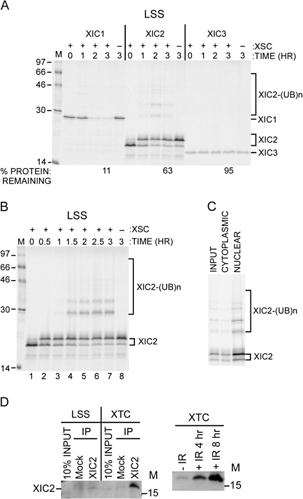 Figure 1. Xic2 is ubiquitinated and degraded in a DNA dependent manner. A. Degradation assay. 35S-methionine labeled Xic1, Xic2, and Xic3 were incubated in Xenopus interphase egg extract (Low Speed Supernatant, LSS) in the absence (-) or presence (+) of Xenopus sperm chromatin (XSC) for 0 to 3 hours as indicated. The mean percentage of remaining protein from two independent experiments is shown (% protein remaining) where the zero hour time point was normalized to 100%. Xic1, Xic2, and Xic3 protein bands are marked on the right including ubiquitinated [(UB)n] forms of Xic2. B. Xic2 ubiquitination assay. 35S-methionine labeled Xic2 was incubated in LSS with methyl ubiquitin (3 mg/ml) to stabilize the ubiquitinated species in the absence (-) or presence (+) of XSC for 0 to 3 hours as indicated. Xic2 protein bands are marked on the right including ubiquitinated [(UB)n] forms. C. Nuclei spin down assay. Nuclei spin down assay was employed to separate cytosolic (CYT) and nuclear fractions (NUC) after incubation of [35S]-methionine labeled Xic2 with LSS containing XSC. The input (INPUT) represents 1/15th of the sample before centrifugation and the cytosolic (CYT) represents 1/15th of the cytosolic fraction after centrifugation. Xic2-(UB) n denotes ubiquitinated Xic2. D. Xic2 immunoblot. Left panel: Xenopus LSS or XTC cell extracts were immunoprecipitated (IP) using anti-Xic2 (XIC2) or normal rabbit serum (Mock) antibody and then immunoblotted with anti-Xic2 antibody. Ten percent of the immunoprecipitation reaction was loaded directly (10% INPUT). Right panel: XTC cells were treated with gamma irradiation (IR, 10 Gy) and harvested 4 or 8 hrs following treatment. Lysates were then examined by immunoblotting with anti-Xic2 antibody. For all figures, the molecular weight marker (M) is shown in kilodaltons.