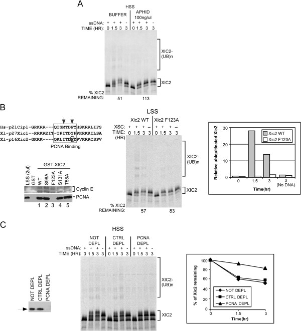 Figure 3. Xic2 is degraded in a PCNA-dependent manner. A. Xic2 degradation assay. 35S-labeled Xic2 was incubated in HSS with (+) or without (-) ssDNA (ΦX174) with buffer (methanol) or aphidicolin (100 ng/ul). The mean percentage of remaining Xic2 from two independent experiments is shown (% Xic2 remaining) where the zero hour time point was normalized to 100%. B. Left top panel: Sequence alignment of the PCNA binding domain in human p21Cip1, Xenopus p27Xic1, and Xenopus p16Xic2. The arrows indicate the critical PCNA binding amino acids in p21Cip1. The rectangle indicates the PIP box sequences and the circle indicates the residue (F123) mutated to disrupt PCNA binding. Left bottom panel: Xic2 GST pull-down assay. GST, GST-Xic2 wildtype (WT), or GST-Xic2 mutants (S98A, F123A, S131A, or T58A) were bound to beads and incubated with LSS. Bound fractions were analyzed by immunoblotting with α-XCyclin E (top) or α-PCNA antibody (bottom). 20% of the input reaction is shown in the left lane (LSS 2ul). Middle panel: Xic2 degradation assay. 35S-labeled Xic2 wildtype (WT) or F123A were incubated in LSS with (+) or without (-) 10 ng/ul XSC. The mean percentage of remaining Xic2 from two independent experiments is shown (% Xic2 remaining) where the zero hour time point was normalized to 100%. Right panel: The mean relative ubiquitinated Xic2 WT or F123A from two independent experiments. C. PCNA Depletion and Xic2 degradation. Left panel: PCNA immunoblot of HSS not depleted (NOT DEPL), control-depleted (CTRL DEPL), or PCNA-depleted (PCNA DEPL). Middle panel: 35S-labeled Xic2 in HSS that was not depleted (NOT DEPL), control-depleted (CTRL DEPL), or PCNA-depleted (PCNA DEPL) with (+) or without (-) ΦX174 (ssDNA, 10 ng/ul). Right panel: The mean percentage of Xic2 remaining from two independent experiments is shown. For all figures, the ubiquitinated Xic2 protein bands are indicated as “XIC2-(UB)n”.