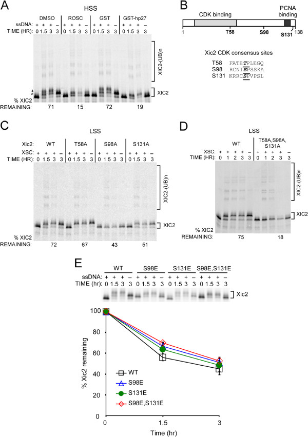 Figure 5. Phosphorylation of residue S98 by CDK2 stabilizes Xic2. A. Degradation assay. 35S-labeled Xic2 was incubated in HSS with buffer control (DMSO), 1mM roscovitine (ROSC), GST (10uM), or GST-hp27 (10uM) with (+) or without (-) ΦX174 (ssDNA, 10ng/ul). The mean percentage of Xic2 remaining from two independent experiments is shown (% Xic2 remaining) where the zero hour time point was normalized to 100%. B. Schematic representation of Xic2 and S/T-P consensus sites. C. Xic2 degradation assay. 35S-labeled Xic2 wildtype (WT) or CDK phosphorylation mutants (T58A, S98A, or S131A) were incubated in LSS with (+) or without (-) XSC (10ng/ul). The mean percentage of remaining Xic2 from three independent experiments is shown (% Xic2 remaining) where the zero hour time point was normalized to 100%. D. Xic2 degradation assay. 35S-labeled Xic2 wildtype (WT) or triple-mutant (T58A, S98A, S131A) was incubated in LSS with (+) or without (-) XSC (10ng/ul) for 0 to 3 hrs as indicated. The mean percentage of remaining Xic2 from three independent experiments is shown (% Xic2 remaining) where the zero hour time point was normalized to 100%. E. Xic2 degradation assay. Top panel: 35S-labeled Xic2 wildtype (WT) or glutamic acid phosphomimetic E mutants (S98E, S131E, or S98E/S131E) were incubated in HSS with (+) or without (-) 10 ng/ul ssDNA (ssDNA) for 0 to 3 hrs as indicated. Bottom panel: The percentage of Xic2 remaining was calculated for each sample where the zero hour time point was normalized to 100%. Error bars (Standard error of the mean) are shown. P values were calculated by student t-test comparing each sample with wildtype Xic2 (WT). 1.5 hr p values: S98E (0.115), S131E (0.310), and S98E/S131E (0.015). 3 hr p values: S98E (0.370), S131E (0.603), and S98E/S131E (0.172). For all figures, the ubiquitinated Xic2 protein bands are indicated as “XIC2-(UB)n”.